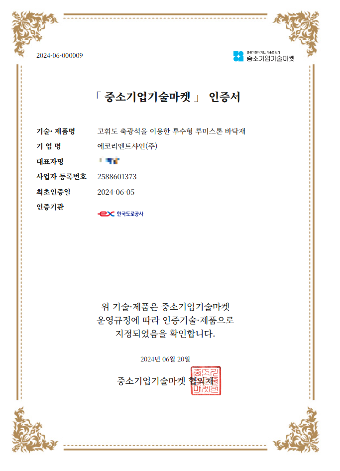 | 안정성 | 적은 충격에도 과도한 크랙과 변형이 일어나고, 중금속이 검출되는 경우도 있음 | 물리적, 화학적 안정화를 통해 반영구적 사용이 가능하고, 포면 마찰 및 탈락 방지, 충격 저항성이 우수하며, 방사능 물질 및 중금속 불검출 |