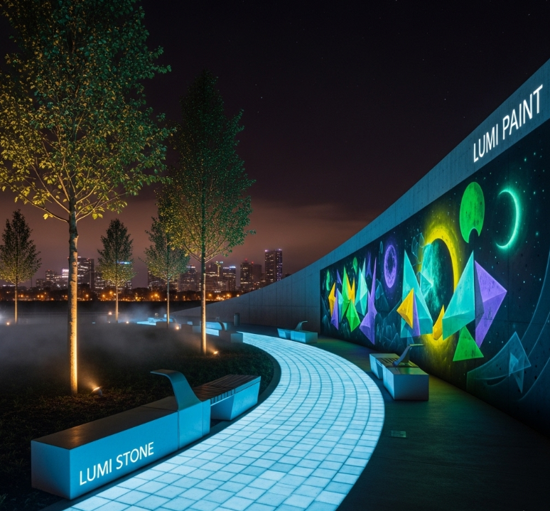 - 루미페인트(LUMI PAINT축광페인트): 고대 벽화의 신비로운 안료처럼, 빛을 흡수하여 어둠 속에서 발광하는 특수 페인트입니다. 자전거 도로, 비상 유도선, 예술 작품 등 다양한 공간에 적용되어 시인성과 안전성을 높이는 동시에 환상적인 시각적 경험을 선사합니다.