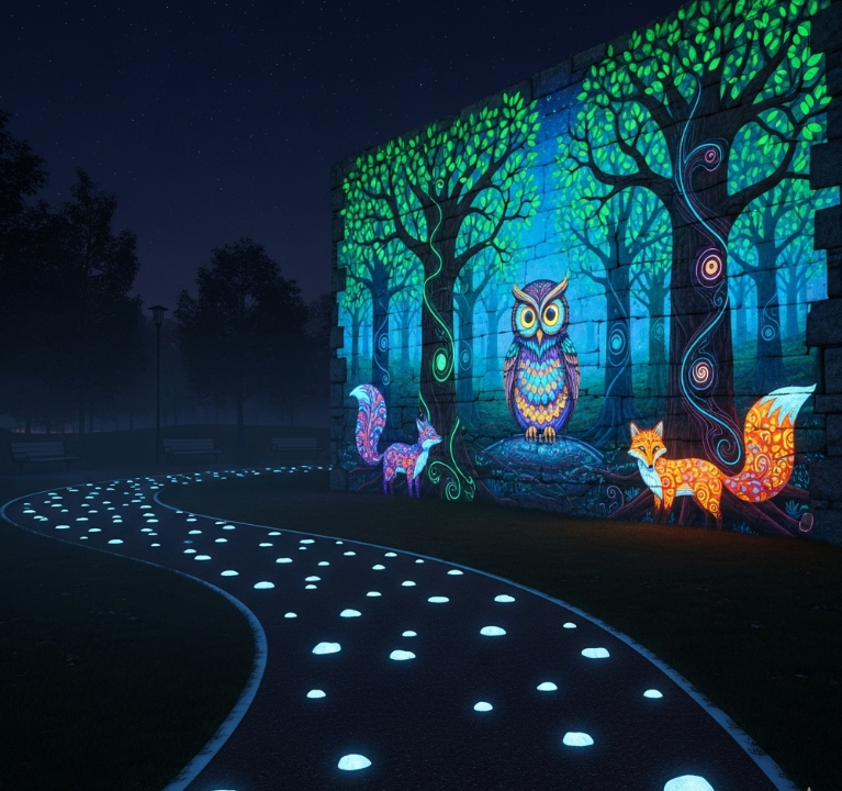 - 제품 특징 및 효과: 야광 페인트, 축광석 시공, 야간 조경, 안전 유도, 친환경 야광, 빛나는 길
