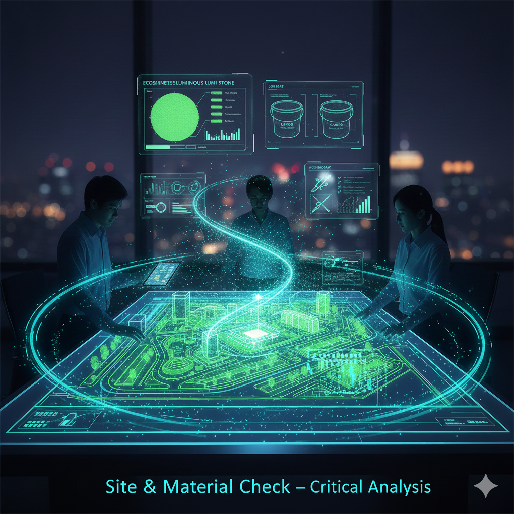 | 3 | 제품 선택 및 조합 | 루미 스톤 또는 루미 페인트 중 시공될 환경(바닥재, 벽면 등)과 요구되는 기능(내구성, 탄성, 투수성 등)에 적합한 제품을 선택하고, 필요시 자연석 등 다른 소재와의 조합 가능성을 검토합니다. (Source 2.2) |