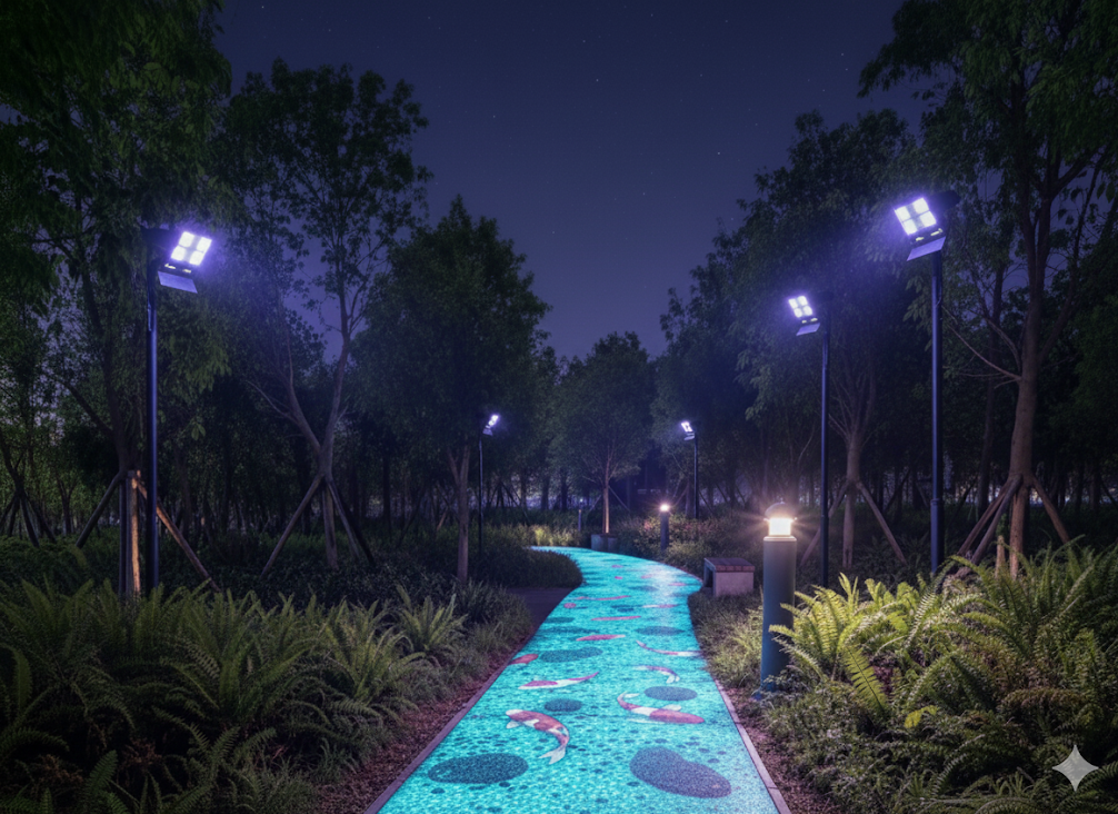 - 루미스톤(LUMI STONE) 축광석: 고대 건축물에서 빛을 품었던 돌처럼, 야간에 은은하게 빛나는 돌입니다. 산책로, 정원, 공원에 시공되어 별도의 전기 장치 없이도 아름다운 경관 조명과 안전 유도 기능을 제공합니다.